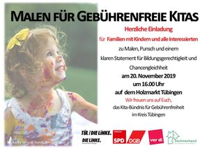 Das Bündnis für die Gebührenfreiheit von Kitas in Tübingen lädt Familien mit Kindern und alle Interessierten zu Malen, Punsch und einem klaren Statement für Bildungsgerechtigkeit und Chancengleichheit ein.
